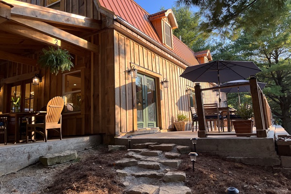 Oversized front porch with table seating for six, allows you to enjoy coffee or meals with friends while listening to the calm of the forest! We have additional outdoor table seating for 10 on the patio overlooking the pool.