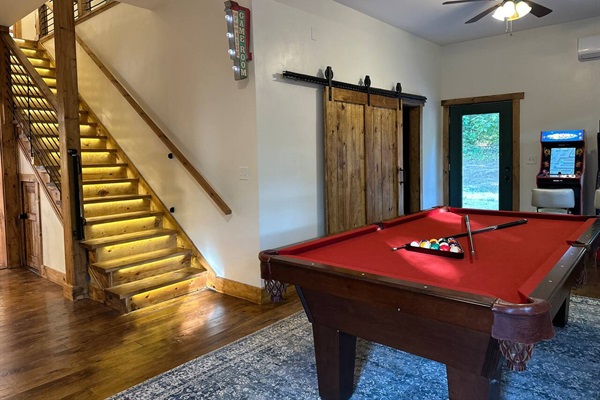 Game room with 8 foot Olhausen pool table, classic arcade games, and AC. Perfect for family fun and rainy day entertainment.